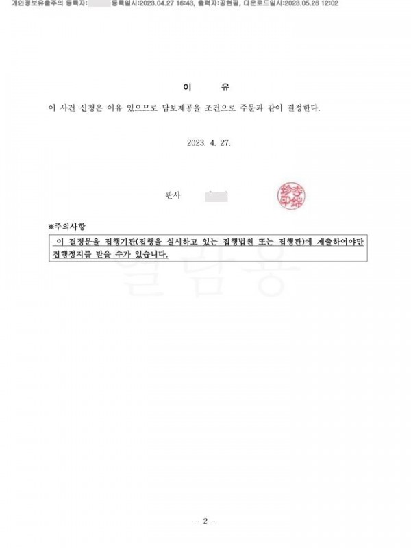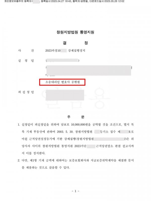 이 때 근저당권말소청구소송을 본안소송으로 제기하고 경매절차를 정지시키기 위한 강제집행정지결정을 받는 것입니다.