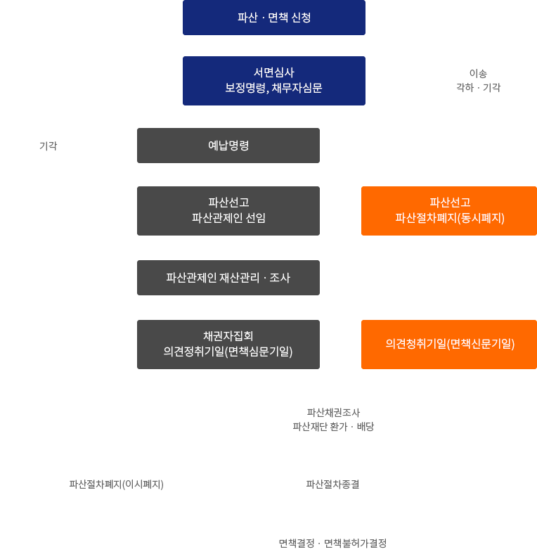 파산채권의 확정과 파산재단의 환가 및 배당절차를 거쳐 면책과 복권에 이르는 일련의 절차입니다.